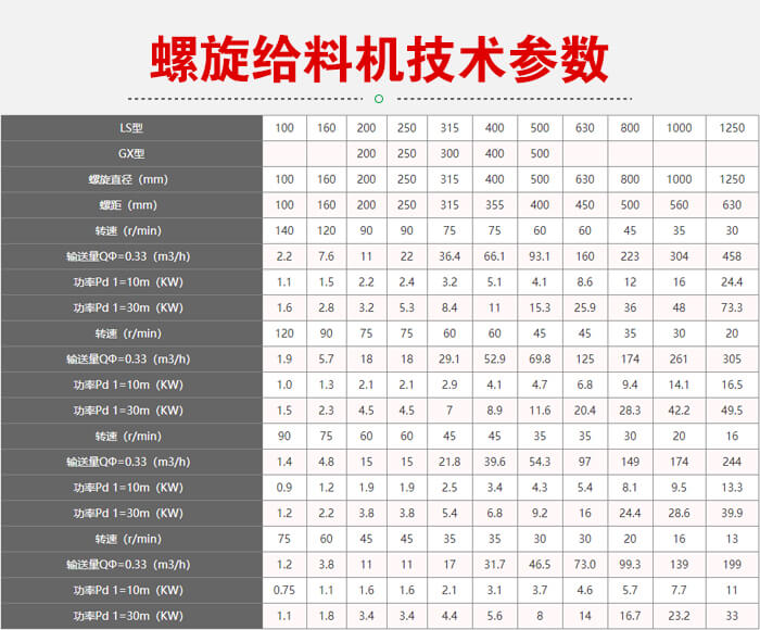 附 螺旋給料機參數表: