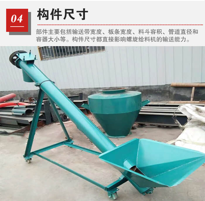 主要包括輸送帶寬度、板條寬度、料斗容積、管道直徑和容器大小等。這些構件尺寸都直接影響螺旋給料機的輸送能力。如螺旋輸送機管徑越大,效率也就越高。當然,并不一定就是輸送機本身才能影響效率,物料的各種性質也都會對效率有所影響。