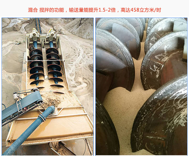 雙軸螺旋輸送機是兩片螺旋葉片組合而成,兩根螺旋軸相反方向旋轉(zhuǎn),具備混合、攪拌的功能,輸送量能提升1.5-2倍,高達458立方米/時。