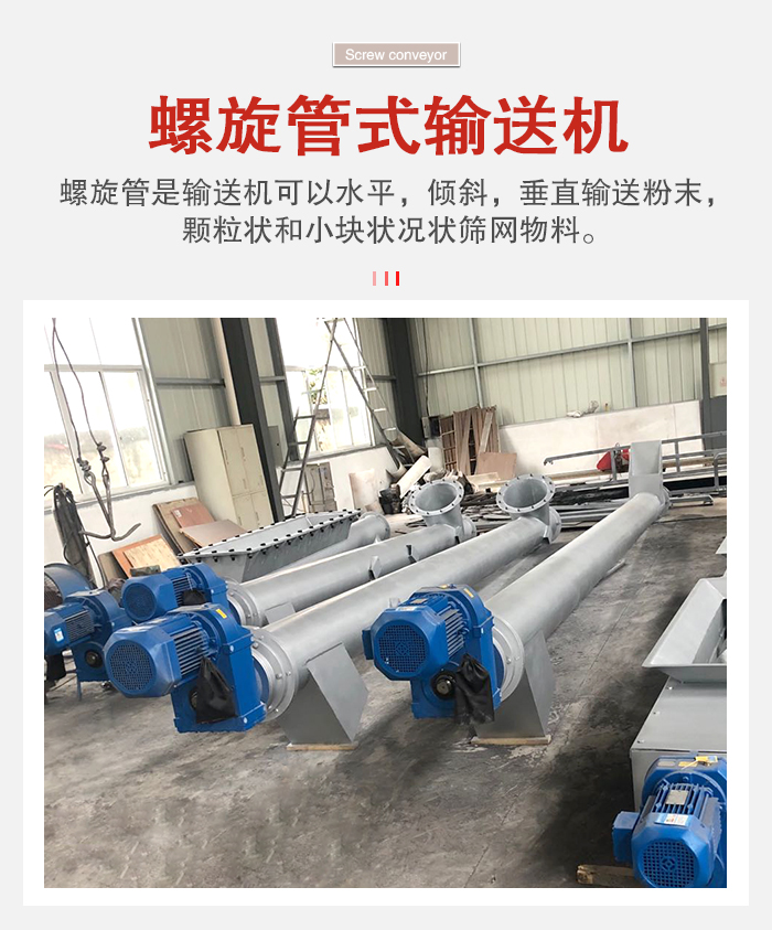 螺旋管式輸送機是依靠電機帶動螺旋回轉,對物料進行推移從而實現,輸送的目的的一種連續輸送設備,可以水平,傾斜,垂直輸送粉末,顆粒及小塊狀物料。有結構電簡單,橫截面小,密封性好,操作方便,維修員容量的。