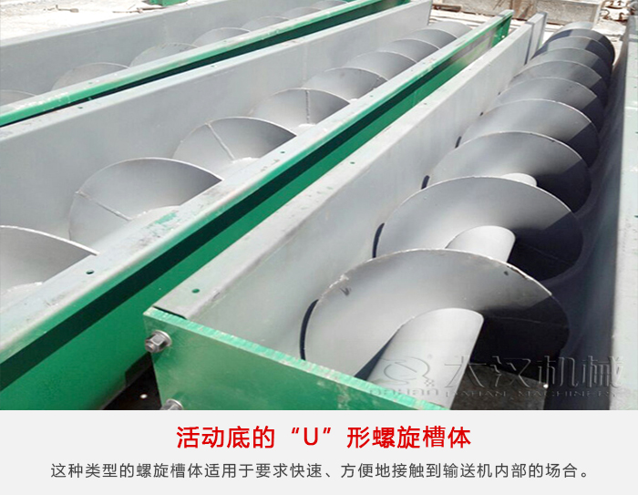 這種類型的螺旋槽體適用于要求快速、方便地接觸到輸送機內部的場合。活動底的U形螺旋槽體由上部剛性的槽鋼與下部半圓形截面槽上體所構成,半圓形截面槽體的一邊為鉸接面,另一邊則采用彈簧卡子夾緊或其他形式能快速打開的連接裝置。
